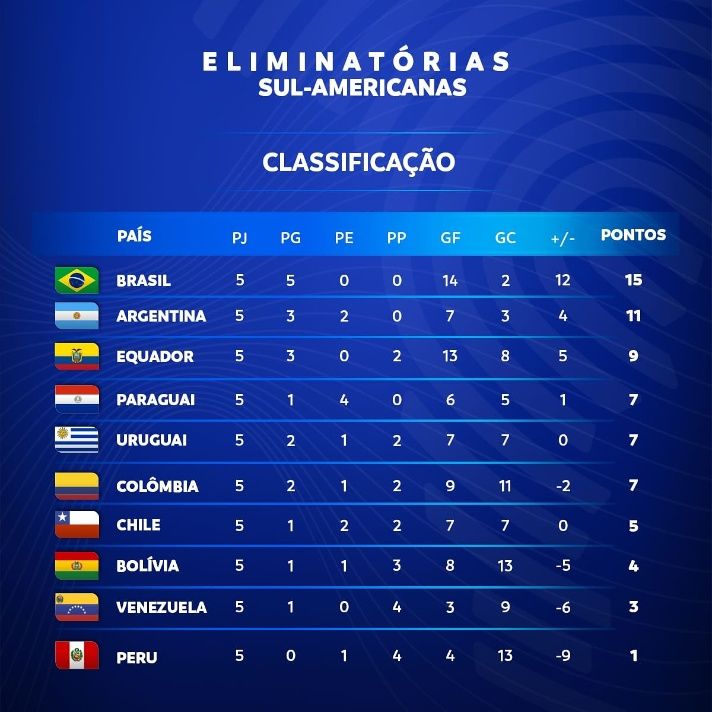 Após cinco rodadas das Eliminatórias, que terão 18 jogos no total, o Brasil é o único que venceu todas as partidas disputadas até o momento e um dos três invictos ao lado de Argentina e Paraguai. A liderança, porém, está garantida por pelo menos uma rodada, já que a Seleção Brasileira soma 15 pontos, quatro a mais do que a segunda colocada Argentina.