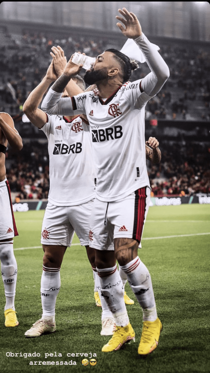 Na última quarta-feira (17), o Flamengo derrotou o Athletico Paranaense por 1 a 0, na Arena da Baixada, e garantiu a classificação para a semifinal da Copa do Brasil. Ao final do duelo, após serem derrotados, torcedores do time da casa arremessaram cerveja no gramado, em direção aos rubro-negros cariocas. A prática, no entanto, teve efeito contrário e serviu como deboche para Gabigol, que tomou a bebida e agradeceu.