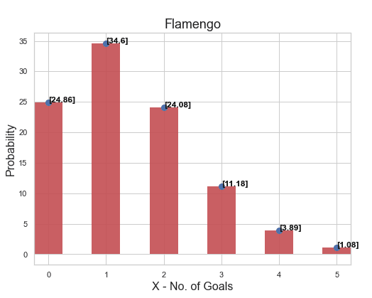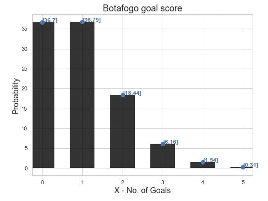 A força do Flamengo pode ser vista neste gráfico, com quase 77% de probabilidade de marcar um gol contra o Botafogo e com alta probabilidade de marcar mais de um gol, próximo a 56%.