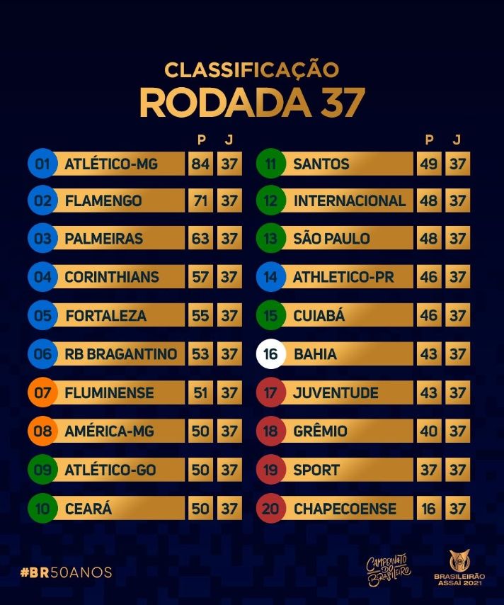 Já o Flamengo do técnico Maurício Souza ocupa a segunda colocação do Brasileirão com 71 pontos em 37 jogos e não sai mais do posto de vice-campeão nacional. Com férias antecipadas ao elenco, o Mengão não terá pretensões na última rodada, mas busca um triunfo para fechar a temporada com a confiança renovada para 2022.