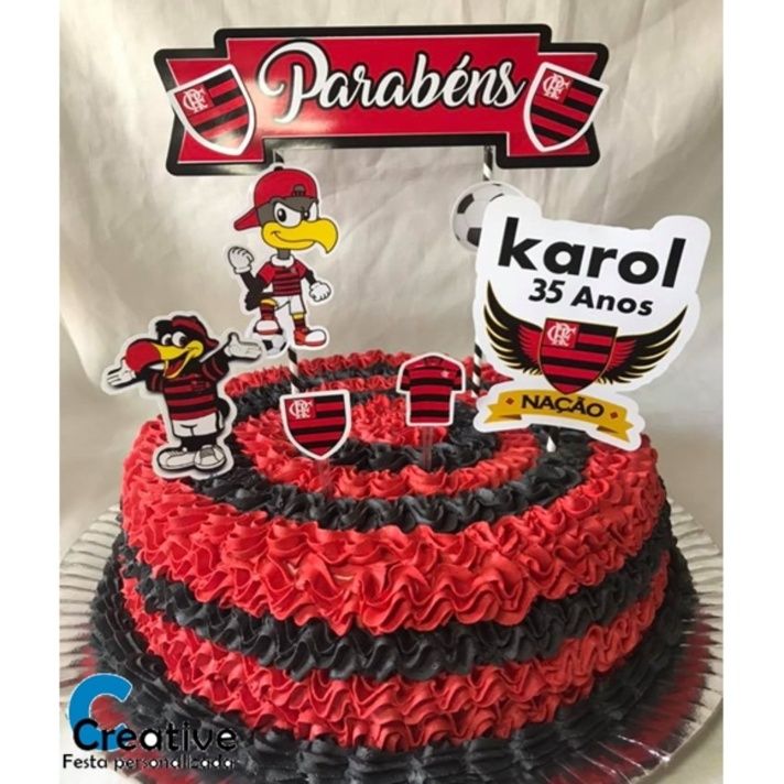 E são várias as decorações do bolo de aniversário do Flamengo com enfeites, recheios e desenhos que dão água na boca e que variam desde as mais simples com os escudos do Flamengo e as cores do Mengão, até a “presença” de jogadores, o urubu, mascote do clube, e até personalizado em outras cores como o rosa.