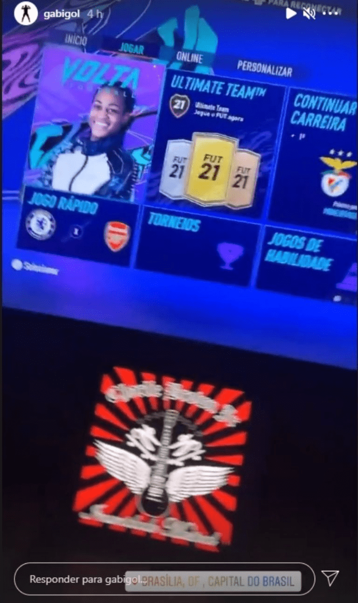 Ao som de Charlie Brown Jr., Gabriel Barbosa mostrou o menu inicial do jogo de futebol e em um dos ícones estava com a opção de continuar a carreira, um modo em que a pessoa se transforma em manager, ou atleta daquele time no mundo virtual, e curiosamente sua equipe é o Benfica, de Portugal, time comandado por Jorge Jesus e o qual defendeu em 2017.