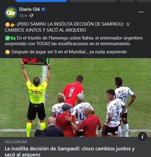 Neste sábado, o Flamengo venceu o Bahia por 3 a 2, pelo Campeonato Brasileiro. O que mais chamou a atenção na partida, foi a atitude de Sampaoli de fazer cinco substituições no intervalo. A decisão mirabolante do treinador foi notícia até na Argentina. O diário Olé, chamou de insólita a decisão e disse que após jogar sem um camisa 9 na Copa do Mundo de 2018 nada mais surpreende vindo de Sampaoli.