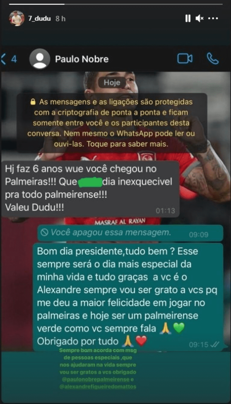 Mas até uma mensagem do ex-presidente do Palmeiras Paulo Nobre pode balançar o atacante. Em sua rede social, Dudu postou uma conversa com Nobre em que é parabenizado pelos seis anos que chegou ao Palmeiras, um marco para ele. Dudu agradeceu e confessou ser palmeirense e grato ao ex-mandatário e ao ex-diretor de futebol Alexandre Mattos.