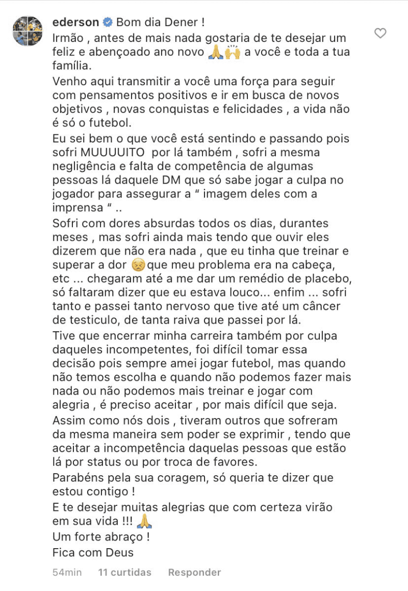 O ex-jogador do Flamengo que se aposentou em 2018 após três anos de clube voltou a levantar um grave problema do Departamento Médico do Mengão. Atualmente com 34 anos e mais de dois anos sem jogar, Ederson que jogou em clube como Lyon, da França, e Lazio, da Itália, teve a carreira abreviada por uma lesão no joelho e também após vencer um câncer no testículo. Mas tudo por culpa de negligência e incompetência do rubro-negro, que viu mais um atleta se despedir precocemente do futebol, o zagueiro Dener, de 23 anos, após lesões.