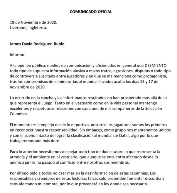 E o clima tenso gerado no vestiário colombiano virou notícias de veículos de imprensa pelo mundo ao falarem sobre brigas e conflitos entre atletas do grupo, principalmente ao envolver os nomes de James Rodríguez, Jefferson Lerma e Davinson Sánchez. E o principal nome do país atualmente emitiu uma nota nesta quinta-feira (19) na qual desmente todos os boatos sobre os atritos e agressões físicas e verbais contra sua pessoa.