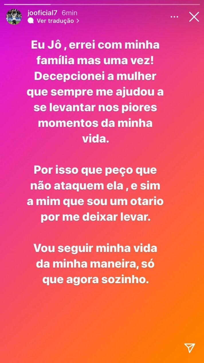 Após a notícia circular pela imprensa, Jô enfim apareceu e utilizou as redes sociais para se desculpar com a família, dizendo que foi "um otário". O anúncio foi feito no instagram, mas a publicação foi deletada rapidamente. No entanto, não antes de alguem tirar um print-screen.