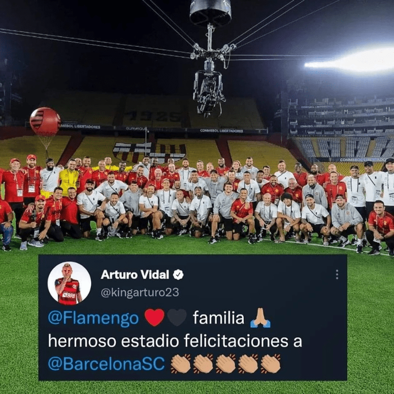 Arturo Vidal já jogou nos estádios mais bonitos do mundo. San Siro, Camp Nou, Allianz Arena, Allianz Stadium, Santiago Bernabéu, Azteca, entre outros. Em sua primeira temporada no Flamengo, o chileno já conquistou o título da Copa do Brasil e está na final da Libertadores da América, após ter disputado uma decisão de Liga dos Campeões da Europa, quando defendia a camisa da Juventus. Em mais uma decisão com a camisa rubro-negra, ele elegeu o estádio da final, o Monumental Isidro Romero Carbo, como o mais lindo, em post nas redes sociais.