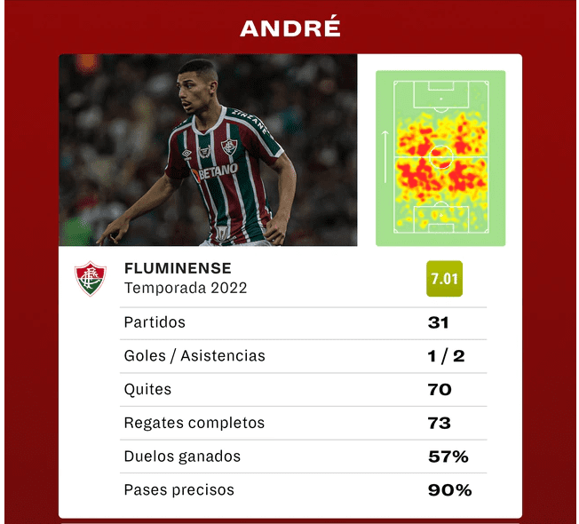 André foi desvelado neste 2022 nas fileiras do Fluminense como um dos meio-campistas mais interessantes para o futuro do futebol brasileiro. Muitos já o consideram o melhor em sua posição no Brasileirão e em todo o futebol sul-americano. Com apenas 20 anos, mostra enorme maturidade em campo e brilha tanto na preparação quanto na tarefa defensiva.