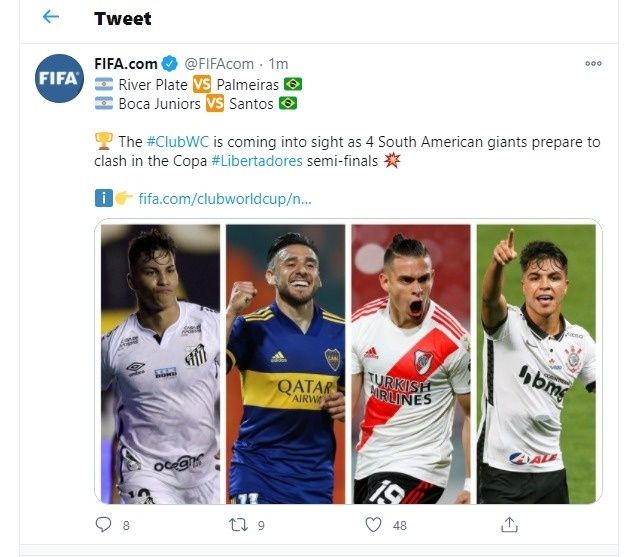 Em uma postagem nesta segunda-feira (4) sobre os semifinalistas da Copa Libertadores, a maior entidade do futebol colocou as quatro equipes que buscam o título e também a última vaga para o Mundial de Clubes 2020, a ser realizado entre os dias 1º e 11 de fevereiro, no Catar, com fotos de Kaio Jorge, do Santos, Eduardo Salvio, do Boca Juniors, Rafael Borré, do River Plate e Roni... Do Corinthians? Sim, a FIFA confundiu o atacante palmeirense Rony, maior destaque do Verdão na Libertadores, com o meia corintiano Roni e lotou as redes sociais com críticas a entidade.