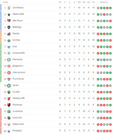No passado fim-de-semana, foi disputada a 6ª rodada do Campeonato Brasileiro. O Corinthians manteve a liderança, num início de temporada que está cada vez mais difícil para Fortaleza e Atlético Goianiense, ainda sem qualquer vitória na competição.