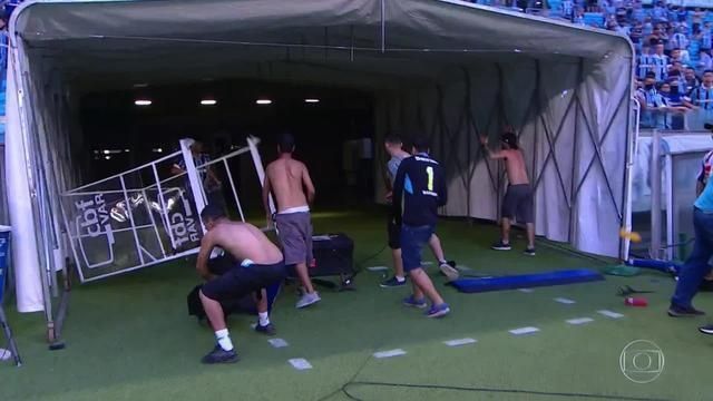 Além das cenas dentro de campo, as câmeras da transmissão da TV Globo também captaram imagens de torcedores de Palmeiras e Grêmio trocando socos, mesmo com uma divisória entre eles, nas arquibancadas da Arena. Com a chegada da polícia gaúcha, a confusão teve fim.