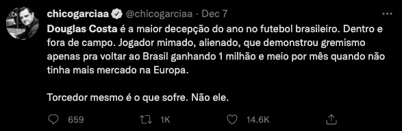 O romance entre Douglas Costa e Grêmio parece não estar dando certo. O jogador não rende dentro de campo e assiste o time caminhar em direção ao rebaixamento sem nada fazer. Para muitos, é a pior contratação do futebol brasileiro no ano. Afinal, custa nada menos do que 800 mil reais por mês aos cofres gremistas, sem contar as cláusulas de produtividade.